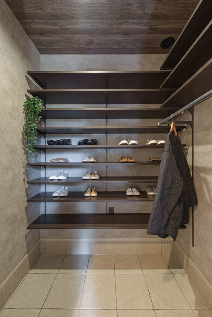 玄関は「家の顔」です。ベビーカー、ゴルフバッグ、キャンプ用品、お子様の部活動の道具など、外で使うものをまるごと受け止める土間収納が活躍します。 「外から帰ってきて、そのまま荷物を置いてリビングへ」というスムーズな流れを作ることで、玄関はいつもゲストを気持ちよく迎えられる状態を保てます。