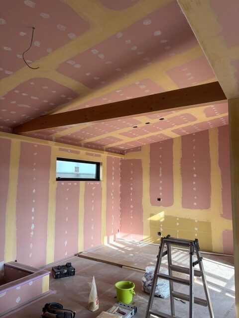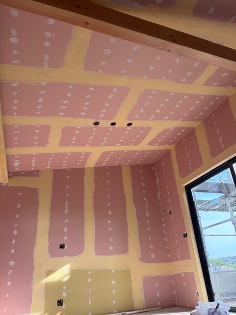 こちらはH様邸、現在クロス工事のパテかい作業中です。